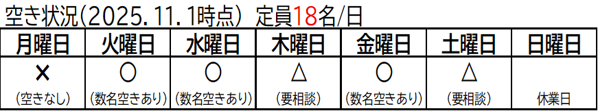 | 備考 | ・現在の登録者数:33名(11/1時点) ・男女比:1:7 ・定員:18名/日 |