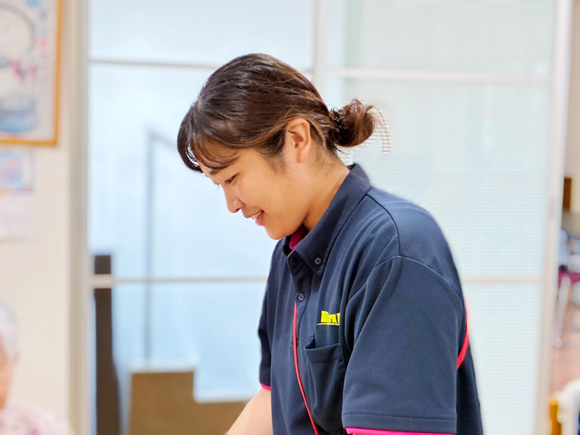 理学療法士として機能訓練だけでなく、送迎含め日々の業務の中でご家族の悩みや自宅環境の悩み、自宅で生活することの大変さなど病院勤務では知る事の出来なかったことをより近くで感じることが多くその中での学びも多いです。